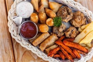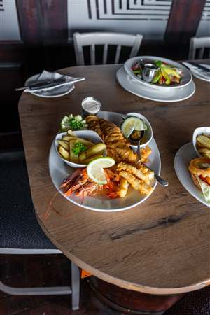 The menu is extensive and includes various breakfast options, tapas and other starters as well as burgers, pasta, salads, pizzas, various pork dishes and steaks. There is also a wide range of Baskets comprising items such as Chicken Nuggets, Samoosas, Chicken Wings, Cocktail Sausages, Spring Rolls, Crumbed Mushrooms, Riblets and much more. There is also a great Seafood selection as well as a range of various combos.
