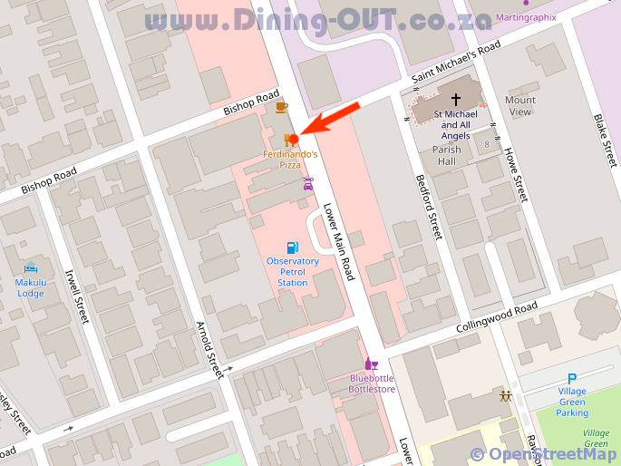 Travel on the M3 from the Southern Suburbs towards Cape Town CBD and take the N2 turnoff. Continue on Liesbeeck Parkway Road until you reach a set of traffic lights, then turn left into Station Road. Continue over the bridge until you reach another set of traffic lights, then turn right onto Lower Main Road. Ferdinando's Pizza will be 260m straight ahead, situated on the left.