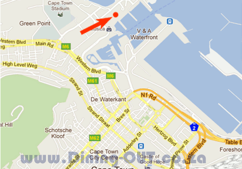 Driving into Cape Town on the N1 or N2, the roads will meet, at the first traffic light next to the Convention Centre, turn right following the boards towards the V&A Waterfront.