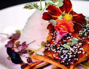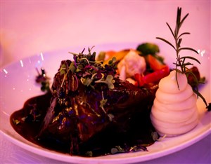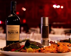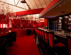 Much of the décor was shipped down from Johannesburg including the spectacular chandeliers which contrast superbly with the stark tubular pipes criss-crossing the enormous ceiling. Dramatic red and black upholstery and luxurious carpeting create an opulent décor, that is off-set by the simple white walls with eye-catching light displays. Certain feature walls have been painted a warm ruby red to create the perfect backdrop for the larger than life 30’s style prints which add the finishing touches to the exciting interior. An impressive bar, handcrafted in rich dark wood, has plenty of seating for those enjoying a pre dinner drink, and offers a selection of speciality cocktails such as the Pigalle Petal (gin, rose syrup and litchi juice) as well as a variety of flavoured martinis.