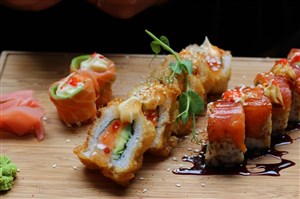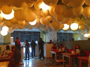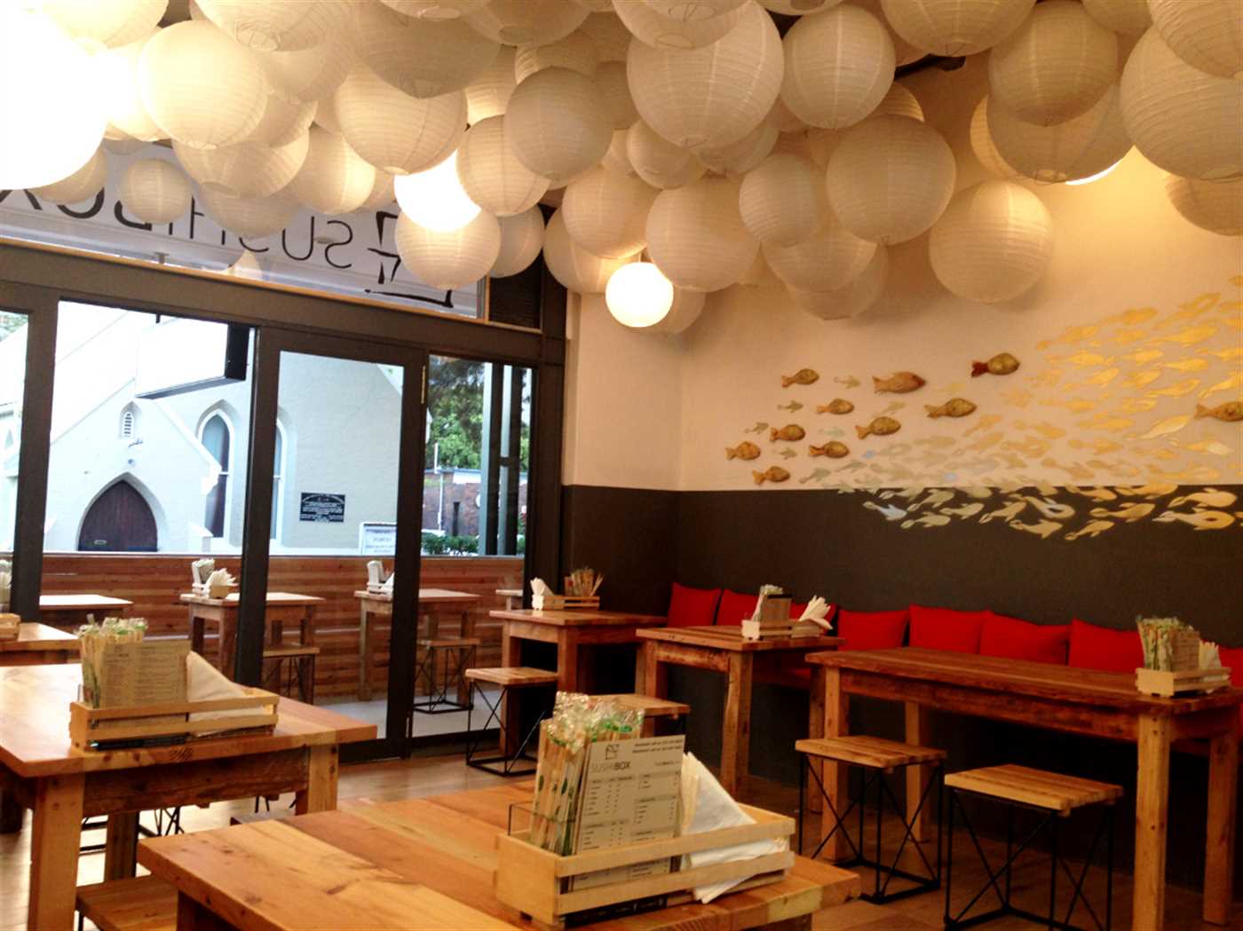 Sushi Box Kloof Street, situated in the vibrant Lifestyle on Kloof centre, Sushi Box Kloof Street offers a cosy ambience, stylish decor, and the freshest sushi in Cape Town. A quaint indoor seating area provides a stylish getaway from the hustle-and-bustle of the city. Much like the Newlands branch, the ceiling is covered with countless white paper lanterns, the colour theme is black, white and red, and gold koi fish paintings and wooden carvings adorn the walls.