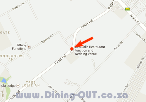 Travel on BEYERS NAUDE in the direction of Muldersdrift, pass Ferreira’s on your left. Continue until you reach a Caltex petrol station on your left hand side. Turn left at the first set of traffic lights into PETER Rd. Travel (1km) along the road until you reach a bend. Turn LEFT at the end of the S-bend and you will find TRèS JOLIE on the LEFT hand side. THERE A BIG sign board attached to a bright orange and green wall. Turn right at the 1st gate into our parking area, follow the path way where you will find an alcove in the wall. Follow the path to our restaurant.