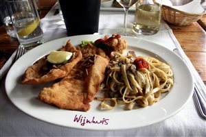 There are a number of choices for visitors to the Wijnhuis. One can choose to be seated for a light lunch under the oak trees at the Wijnhuis Street Café; The upstairs restaurant caters to large groups and is frequented by tourists, local business people, families with children and students from the nearby Stellenbosch University.